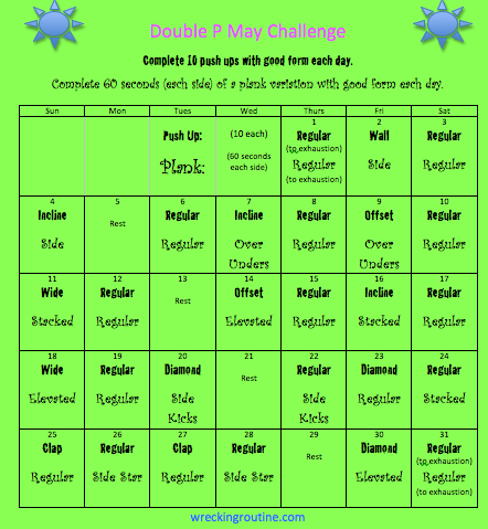 The goal of this challenge is to perfect your push up. All you have to do is a variation of 10, good, strong, solid push ups each day AND 60 seconds of a plank variation per day. After 31 days, push ups should be an easy, off your knees feat!