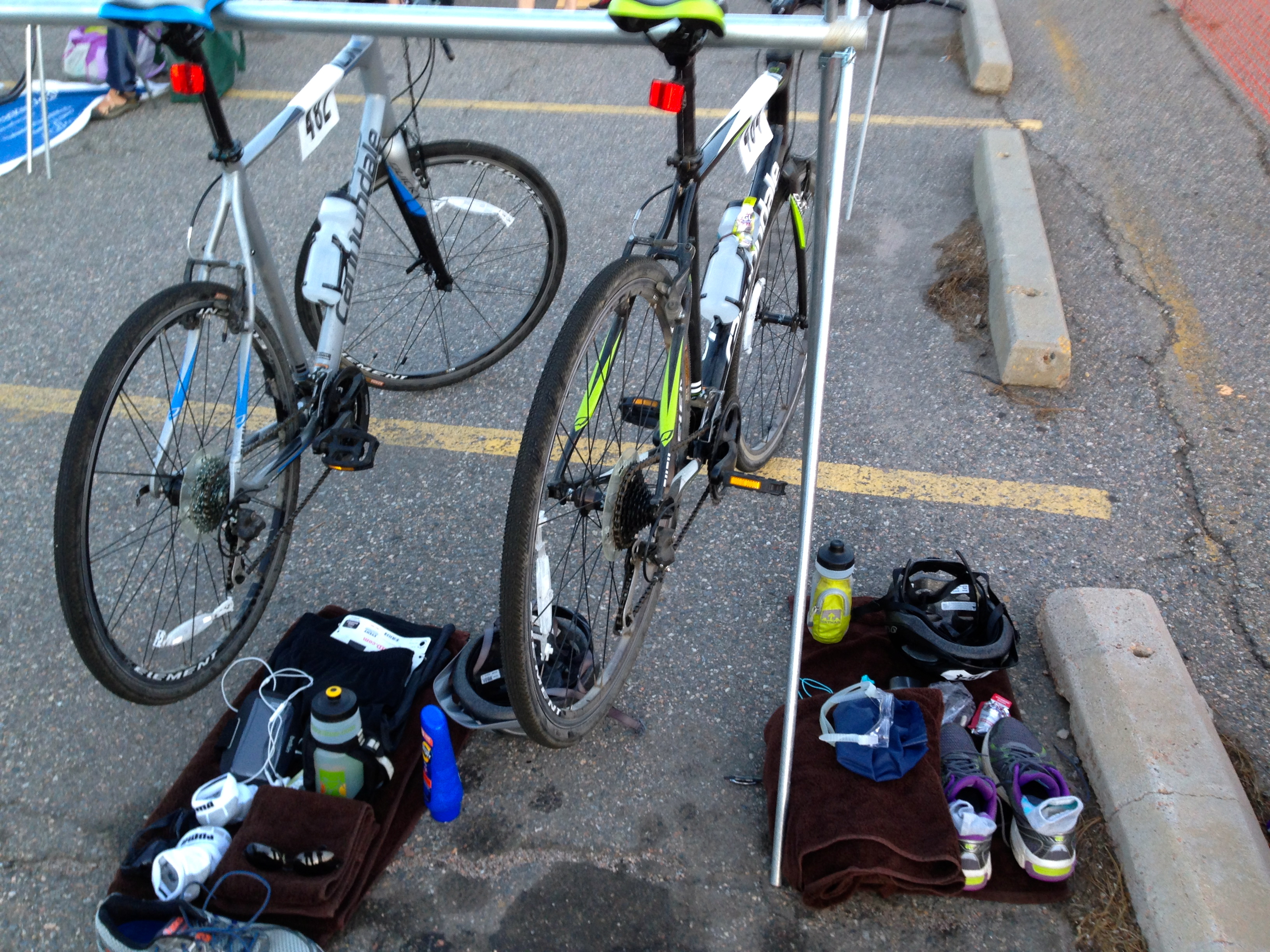 Arrive on race day with entirely too much stuff and with a plan to swim in running shorts and sports bra, so as not to have to change in the transition. Be one of the only competitors without a triathlon suit and fancy road bikes.