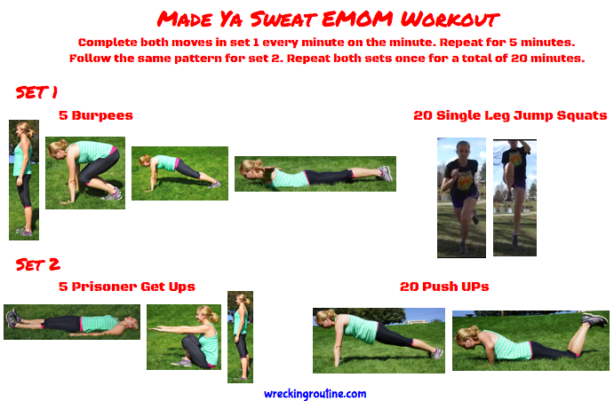 This Made Ya Sweat EMOM Workout only takes 20 minutes to get in one heck of a butt-kicker that works your whole body. The 20 minutes does not include a warm up. Please warm up and stretch for at least 5-10 minutes!