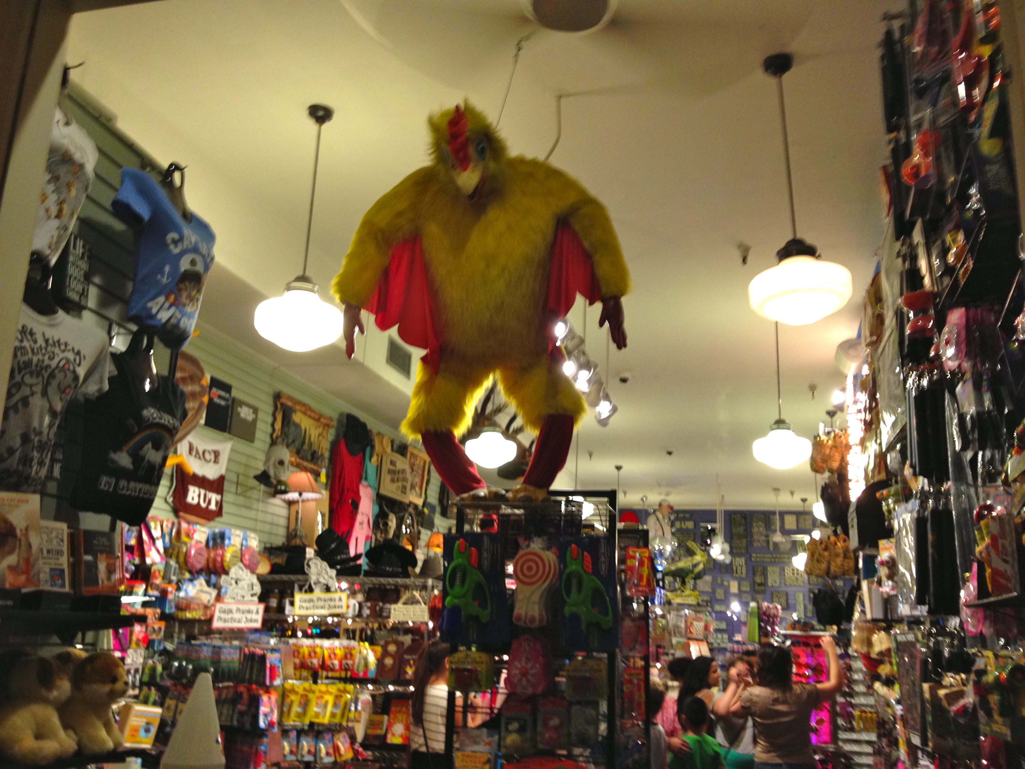 One of my coworkers and I took an after dinner walk and just about jumped out of our skins when we rounded a corned and saw this human sized chicken suit hanging from the ceiling of a novelty shop.