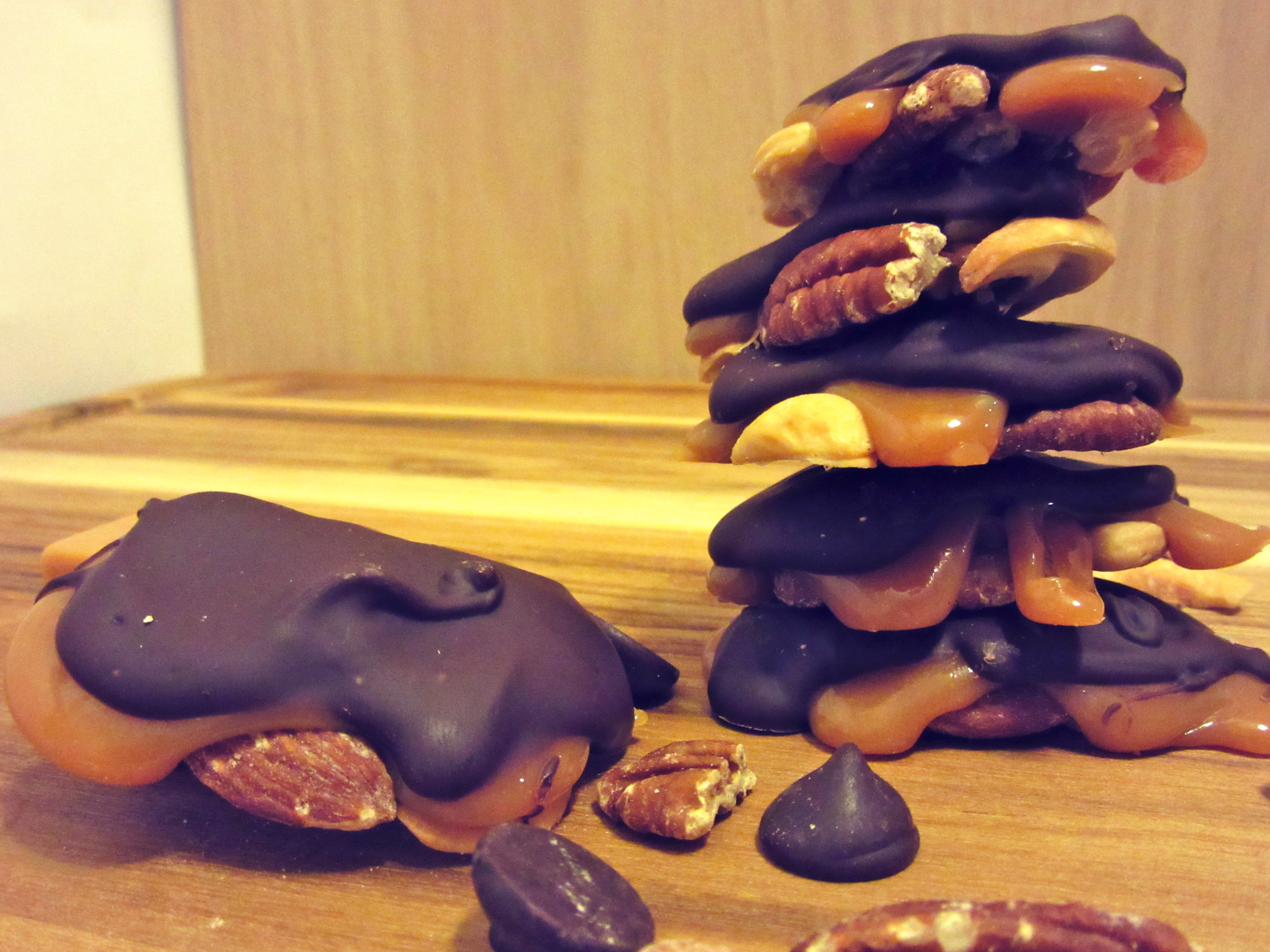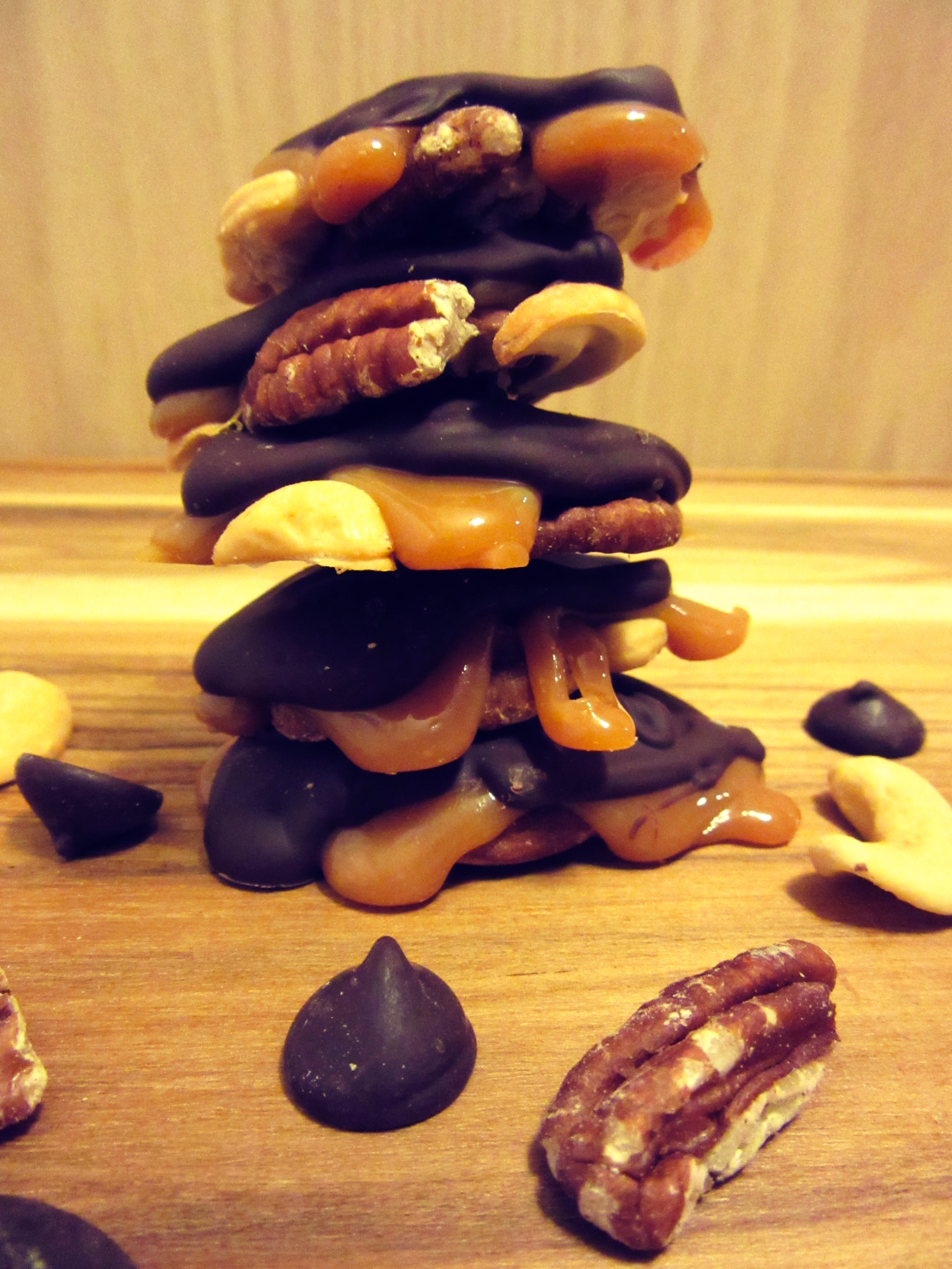 4. Drizzle caramel over nut clusters. Work fast as the caramel hardens quickly!