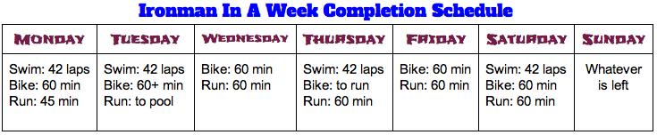 Now, I’m not trying to belittle those who are able to complete an Ironman in one day. Rather, I think they are insanely badass and this is my silly attempt to see what my body can handle in a week what they do in a few hours. True Ironmen and women will forever be held in extreme high esteem to me.