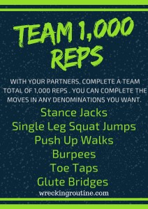 A group fitness workout that is ideal for those who love to work in teams. Divide teams into a max of 6 people and have them race to reach their reps!