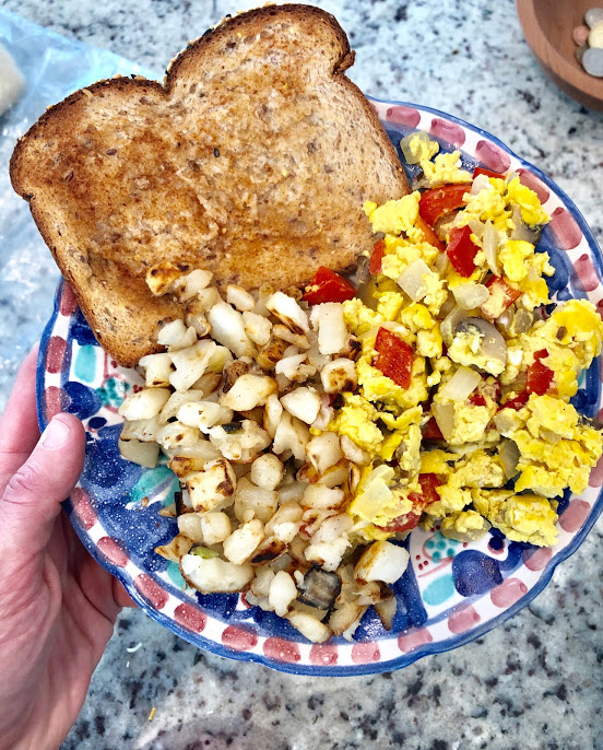 Scrambled eggs and sauteed veggies coming right up! Even better if you planned ahead and meal prepped a few eggs or burritos. Tap into those freezer items.