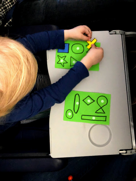 Matching Shapes. Rob and I made this busy bag for Zoey for the first time on our flight to Minnesota for Thanksgiving and she loved it. We made her a second version for the Christmas flight to New York and it was the first busy bag Zoey asked for. These are super easy to make and you could put together a few variations in one sitting.