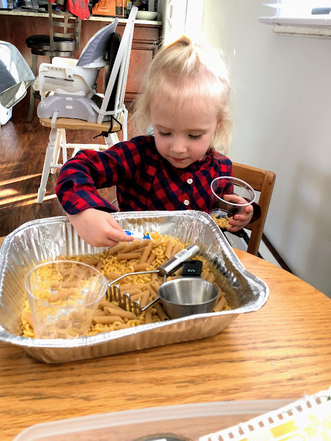 Sensory Bin. Zoey absolutely loves sensory bins and has been known to sit still for quite some time, taking small breaks before coming back to it. Whether dry beans, colorful rice, or dry pasta, as long as there are scoops, cups, and mini ice cube trays, she is a happily entertained camper.