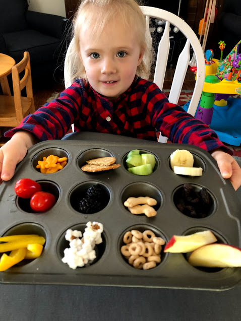 Silly Snacks. While not an official name, it is just what we have dubbed this snack time activity. Putting small amounts of different types of snacks into a mini muffin tin or ice cube tray can get you lots of snack time quiet and excitement from your toddler as they pick out what they want to eat and in what order. Zoey gets positively giddy when we break out a silly snack.