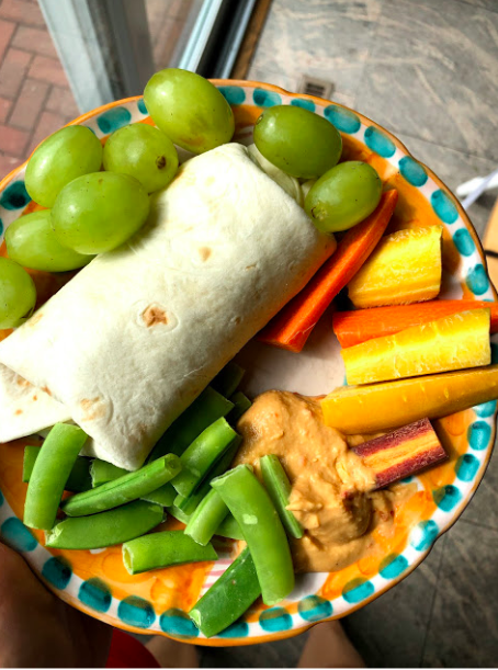 - Hummus, cucumbers, tomatoes, lettuce, feta
