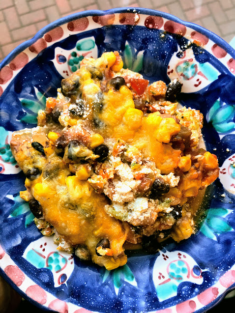 I really enjoy this recipe from Averie Cooks, but we add a few different things to fit what we have on hand. For my family, I double the recipe to fit in a 9×13 inch pan, and top it with a full can of black beans and full can of corn. I also add green chili to one half (Rob loves it) and regular salsa to the other half.
