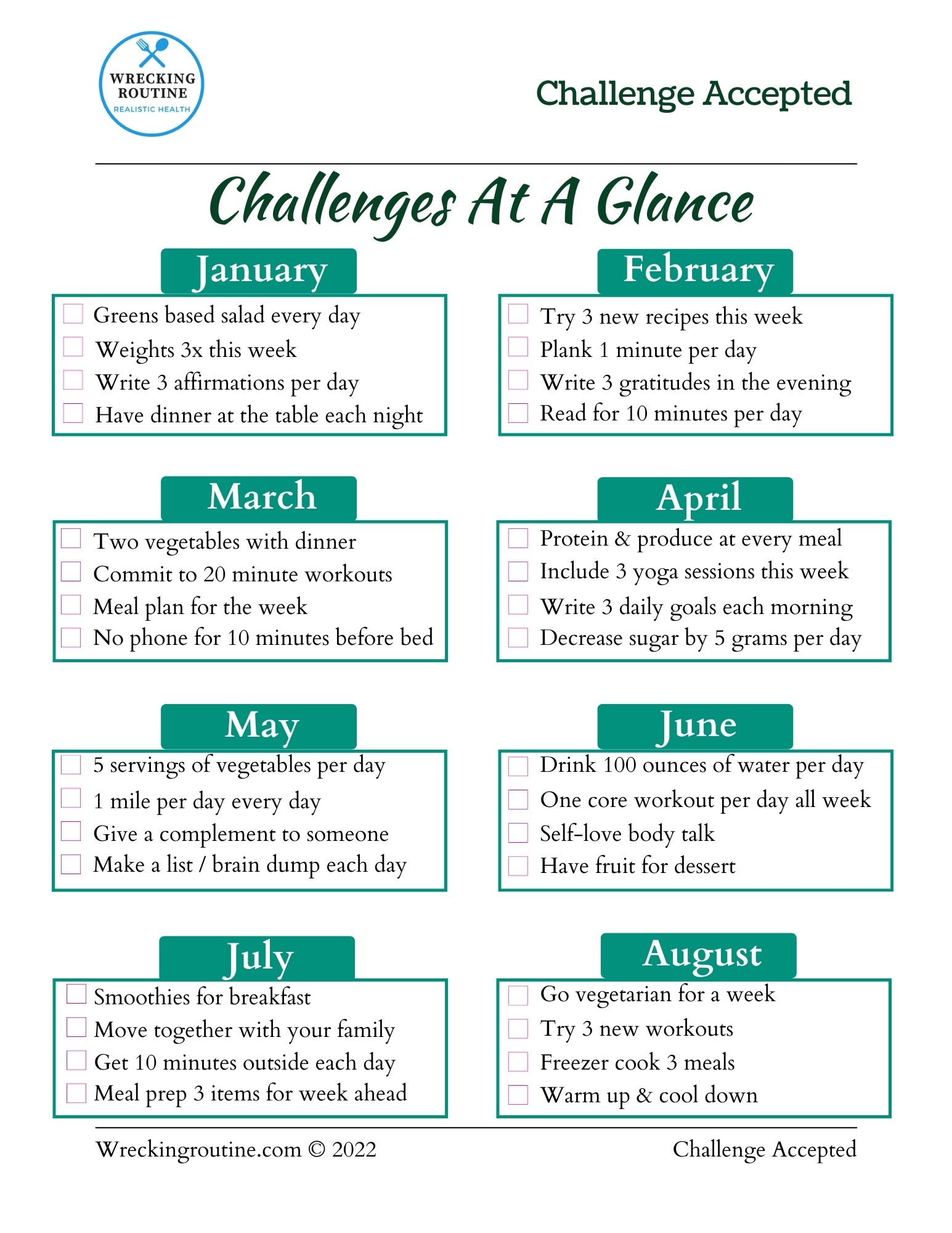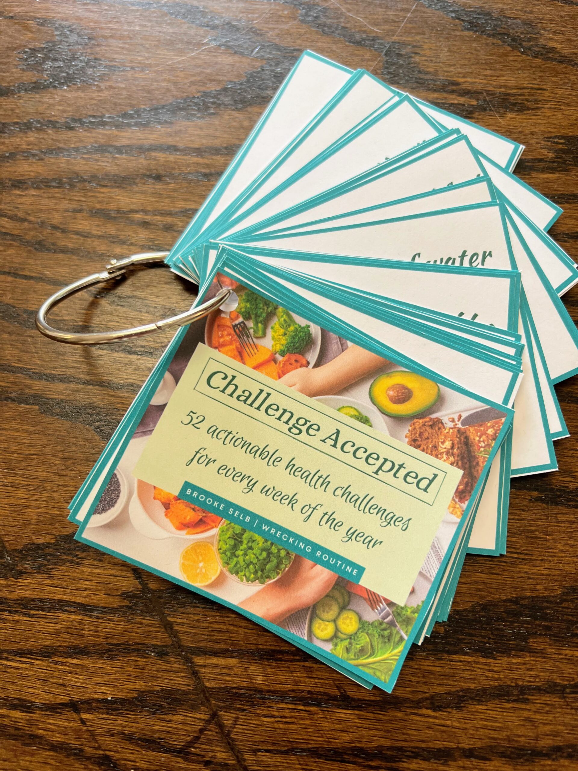 Bring on Challenge Accepted. This pack of micro challenges gives you 52 actionable health challenges for every week of the year. No more starting over. No more health overhaul overwhelm. Just, one challenge each week to get you to narrow in on your health habits and make those lasting changes.